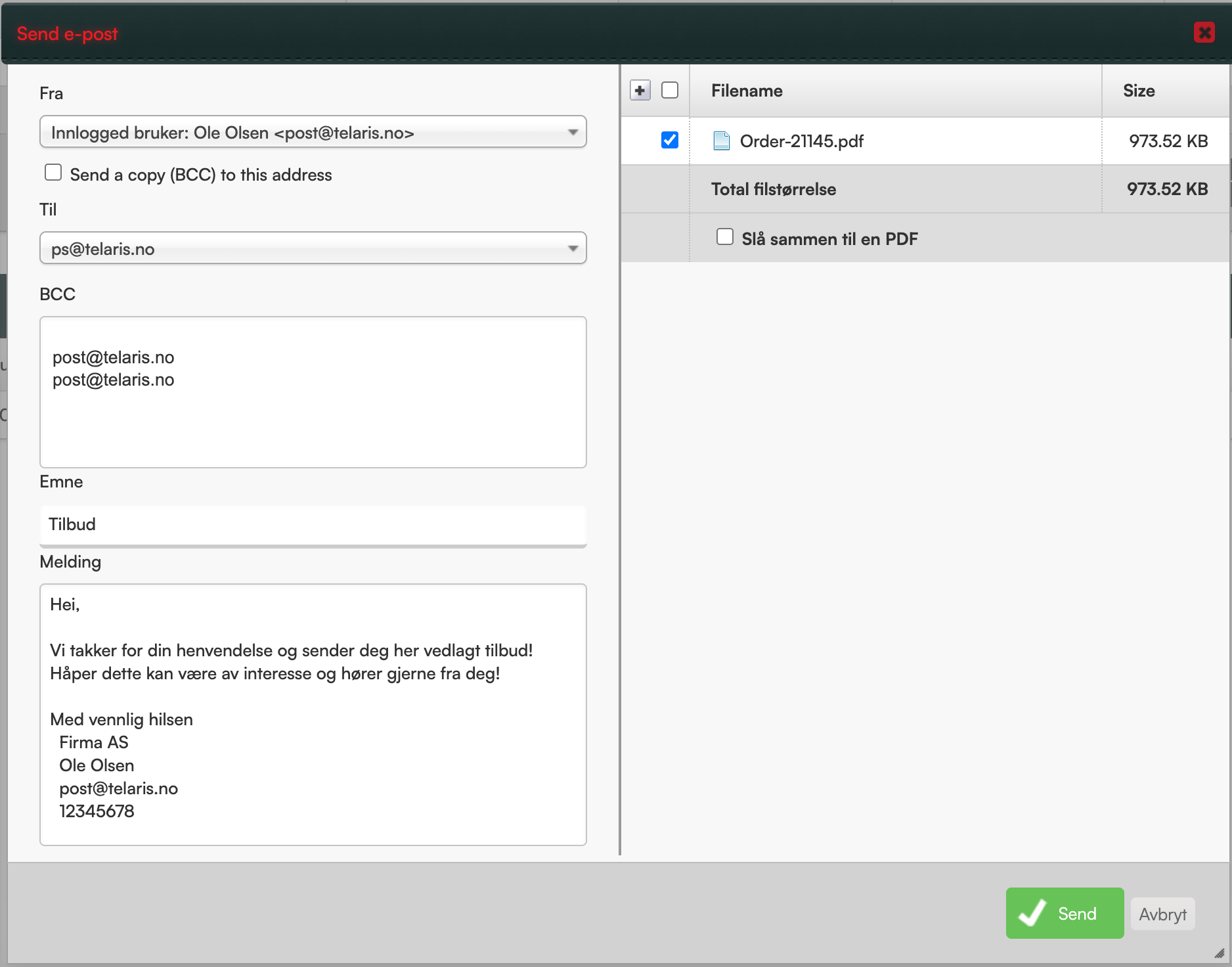 Her finner du muligheten for å forhåndsvise PDF-versjonen av tilbudet samt muligheten til å sende tilbudet på e-post til kunden.