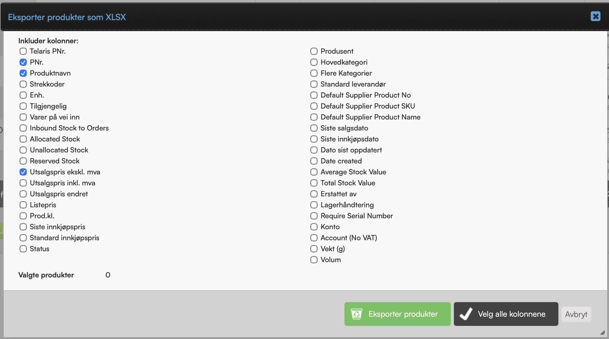 Etter at produktliste til Excel er valgt og det er trykket utfør vil en dialogboks dukke opp. Dialogboksen vil vise hvilke felter det er mulig å få eksportert til Excel.