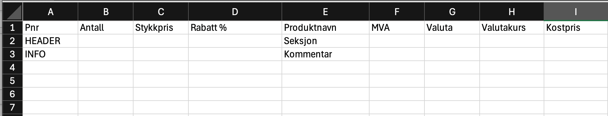 Telaris støtter muligheten for å gjøre en ordreimport ved å lime inn produkter fra Excel