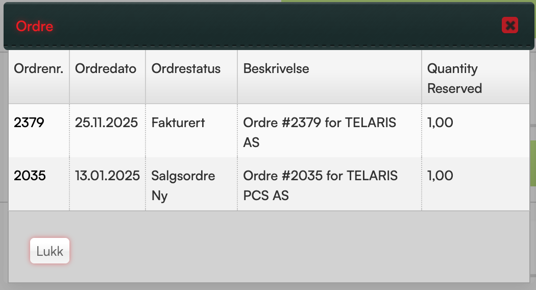 Klikk på antallet reservert, i eksempelet under er det tallet '2'. Da åpnes en dialogboks som viser alle ordre der produktet er reservert.